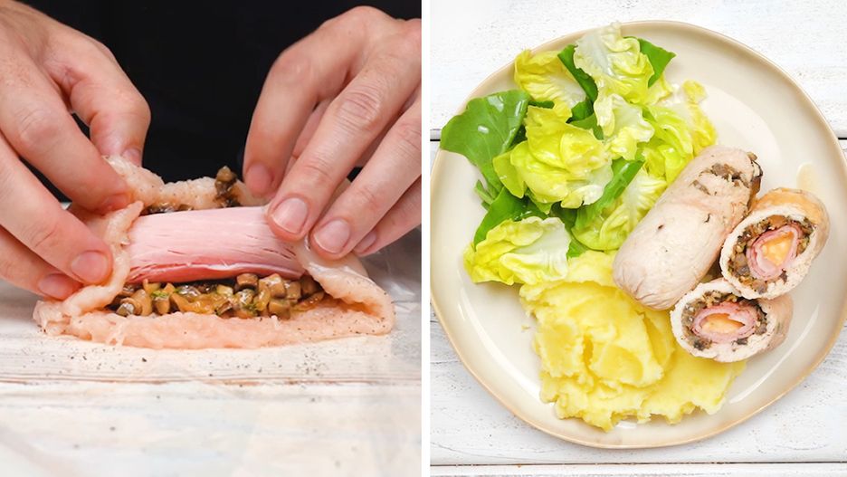 Soczysty obiad z kurczakiem za grosze - pieczone roladki drobiowe z pieczarkami i serem
