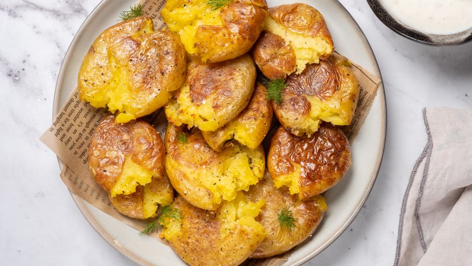 "Crash potatoes" to nic innego jak ugotowane w mundurkach małe ziemniaki, które po lekkim przestudzeniu zgniata się np. dnem szklanki, dłonią lub tłuczkiem. Nie chodzi o rozgniecenie ich na purée – mają się tylko spłaszczyć, tworząc nieregularną powierzchnię. Następnie skrapia się je oliwą, posypuje solą, ziołami i piecze, aż brzegi będą przyrumienione i super chrupiące.