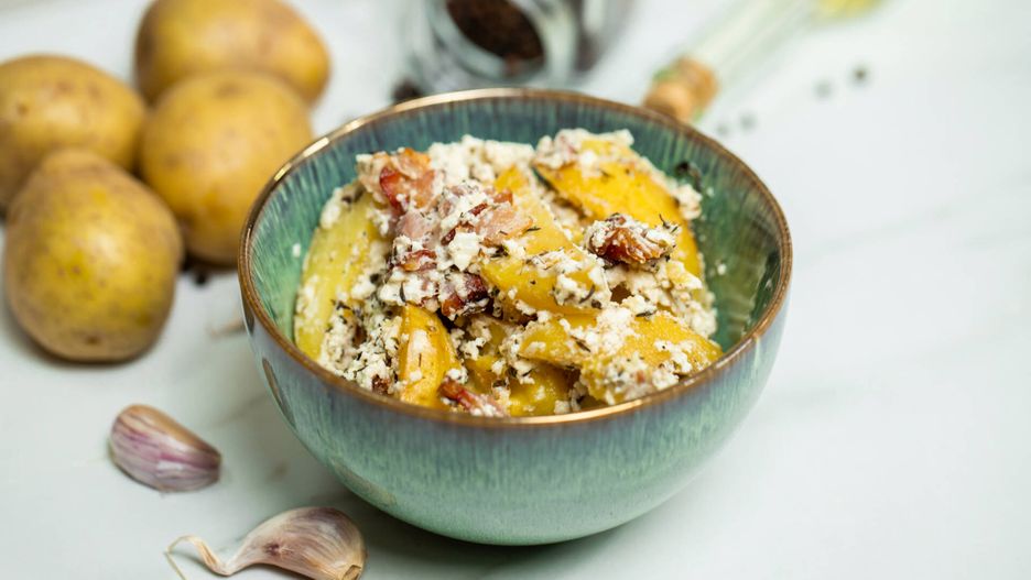 Pieczone ziemniaki z fetą oraz boczkiem - i nie potrzebujesz nic więc, aby przygotować prawdziwą ucztę dla podniebienia w mgnieniu oka. Po prostu palce lizać!