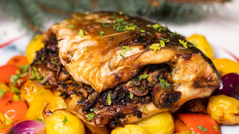 Pieczony karp z pieczarkami