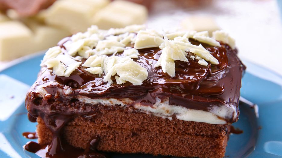 - Przykryj drugim biszkoptem, wyłóż pozostały krem budyniowy i polej polewą czekoladową z rodzynkami.