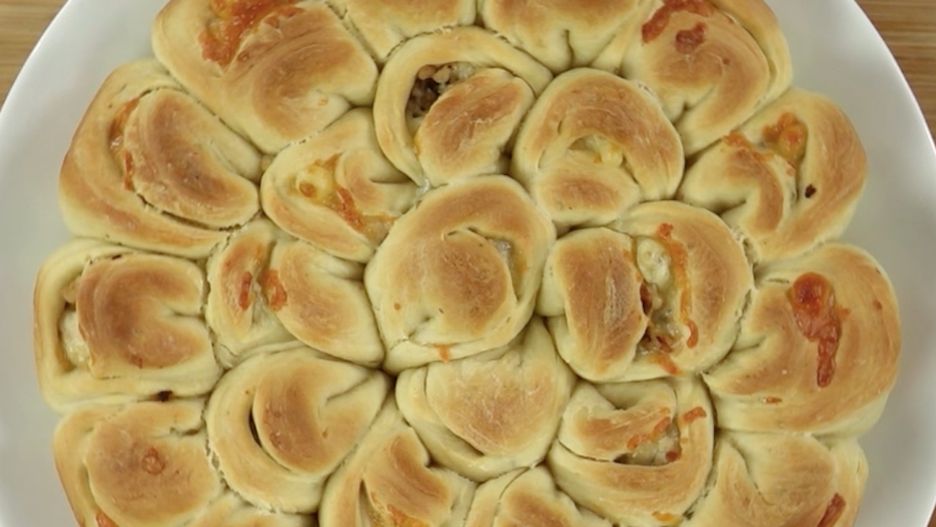 4. Ułóż pierożki na okrągłej blaszce, a następnie włóż do piekarnika rozgrzanego do 175 stopni C. Piecz przez 25 minut.