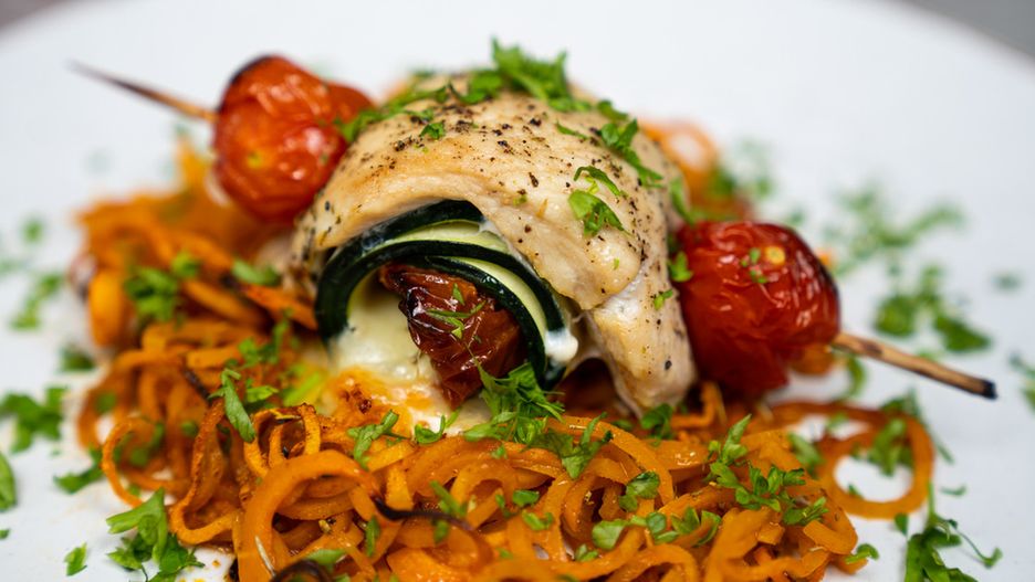 Proste roladki z kurczaka skrywają w sobie cukinię i pomidorka koktajlowego. Dzięki pieczeniu uwalnia się cały jego smak, a sam pomidor staje się miękki i soczysty. To prosty sposób na przemycenie do swojej diety dodatkowej porcji warzyw. Całość upiekliśmy w piekarniku i podaliśmy na lekkim makaronie z marchewki.