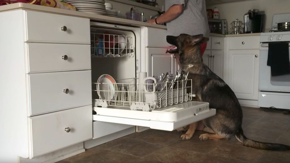 Najlepszym przykładem takiego zachowania jest uroczy owczarek niemiecki Baron, który pomaga swojemu właścicielowi przy wkładaniu naczyń do zmywarki. Coś niesamowitego!