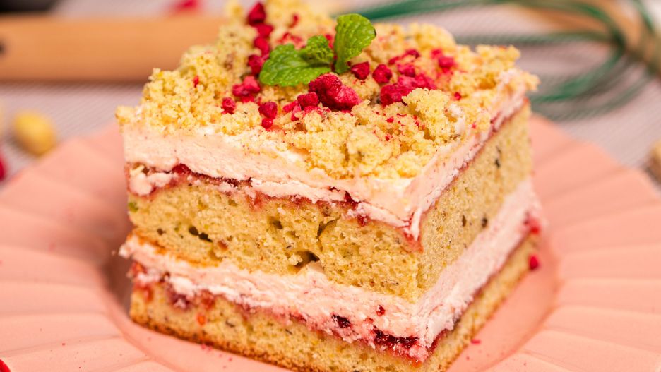 Pistacjowa Dama idealna na urodziny lub imieniny. Kostka pistacjowo-malinowa oczaruje gości