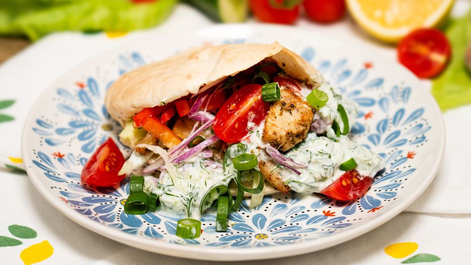 Pita z kurczakiem, warzywami i domowym sosem tzatziki przeniesie na greckie wakacje. Cieszy oko i podniebienie