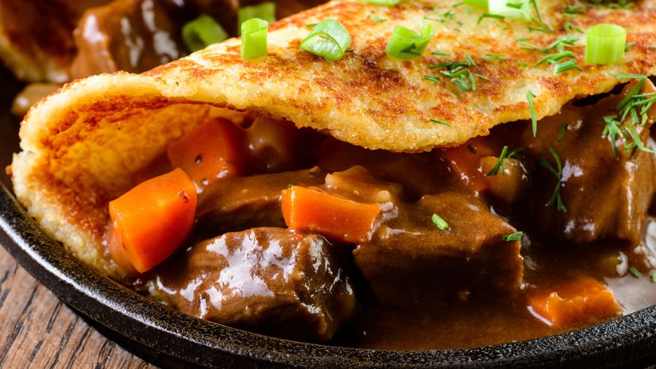Gotowym gulaszem możesz polać placki lub nałożyć część sosu na połowę placka i przykryć drugą połową. Ta metoda pozwala zachować chrupkość części placka, podczas gdy druga nasiąka aromatycznym sosem – obie wersje smakują znakomicie, ale ta druga jest szczególnie atrakcyjna zimą, gdy chcemy poczuć kontrast miękkiego gulaszu i chrupiącego placka.