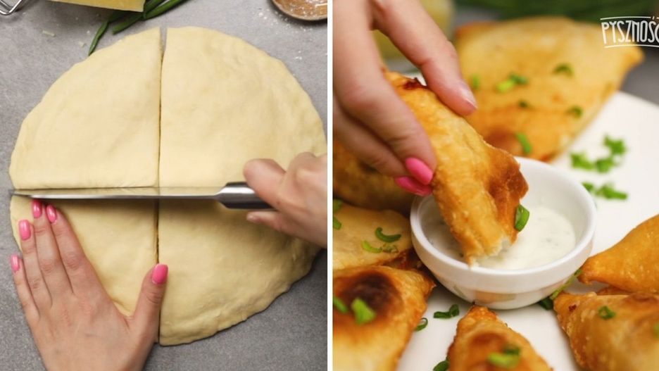 Trójkątne placuszki z kefiru z serowym nadzieniem - przepis wideo: