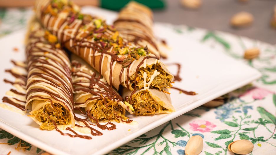 W tym deserze wszystko się zgadza. Są mięciutkie naleśniki, chrupiące ciasto kataifi i uwielbiane przez wielu pistacje. Gdyby słodkości było jeszcze za mało, to całość zwieńczona jest mleczną oraz białą czekoladą. Nie da się ukryć, że to prawdziwa dubajska rozpusta.