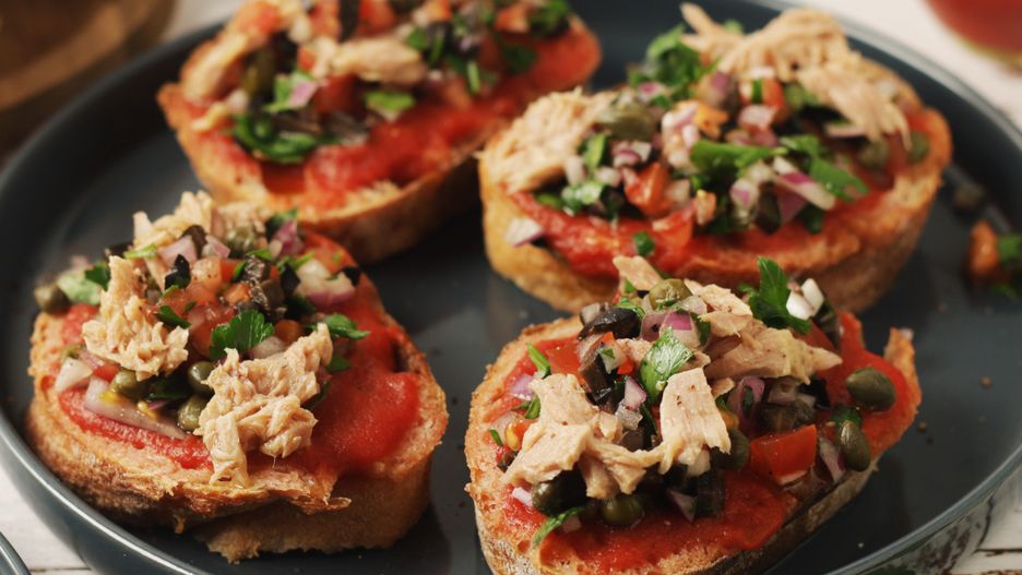 - Na tuńczyku ułóż plasterki cebuli, połówki oliwek i kapary.