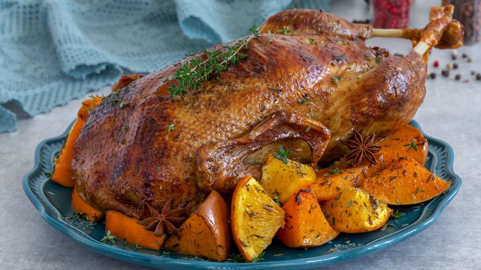 Z pokrojeniem kaczki na porcje odczekaj 10 minut od momentu wyjęcia jej z piekarnika. Dzięki temu buzujące w niej soki będą mogły się ustabilizować, w efekcie każdy kawałek wyjdzie tak samo soczysty i smaczny. Do kaczki na świątecznym obiedzie podaj pieczone ziemniaki z rozmarynem i gęsty sos żurawinowy.