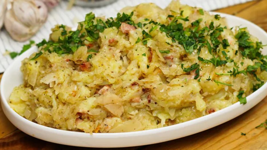 - Do gorących ziemniaków dodaję podsmażoną kapustę z boczkiem i mieszam całość do uzyskania jednolitej konsystencji.