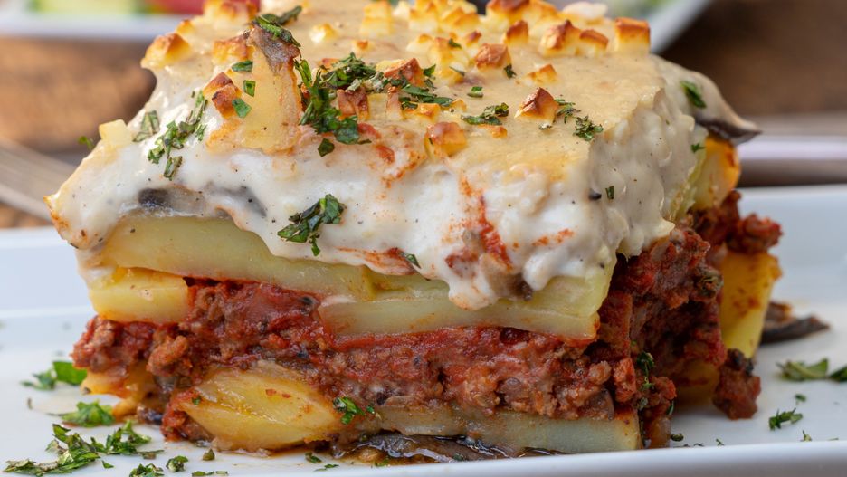 Klasyczna grecka zapiekanka składa się jedynie z bakłażanów, mięsa duszonego w pomidorach i sosu beszamelowego. Ale żeby było konkretniej, pod kremową pierzynką ułóż pokrojone w cienkie talarki ziemniaki. Musaka nie straci greckiego charakteru i nie pozostawi niedosytu.