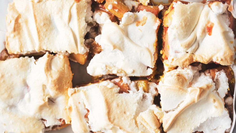 - Na podpieczony spód wyłóż przygotowany rabarbar. Na nim rozprowadź przestudzony budyń, a całość przykryj bezą.