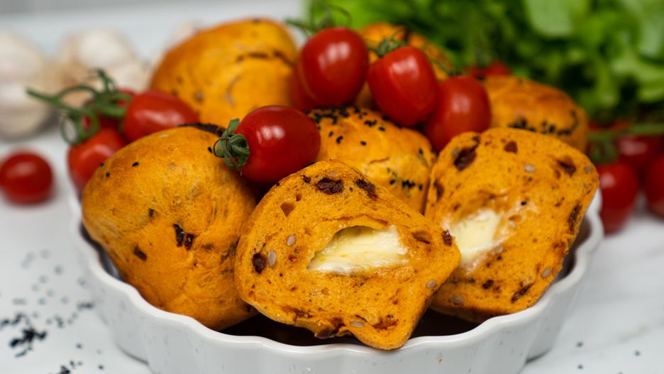 Drożdżowe babeczki pomidorowe skrywają serowe wnętrze z mozzarellą. Ciasto wzbogaciliśmy o suszone pomidory, dzięki czemu nasze babeczki zyskują nieco śródziemnomorski, wakacyjny smak. Skorzystaliśmy też z okazji, żeby przemycić w naszym wypieku porcję zdrowia- nasiona czarnuszki Purella. Mają one nieco pikantny smak i świetnie wzbogacają całe danie. Zawierają dużo błonnika, który korzystnie wpływa na procesy trawienne. W starożytnym Egipcie czarnuszkę nazywano "złotem faraonów" ze względu na jej zdrowotne właściwości.