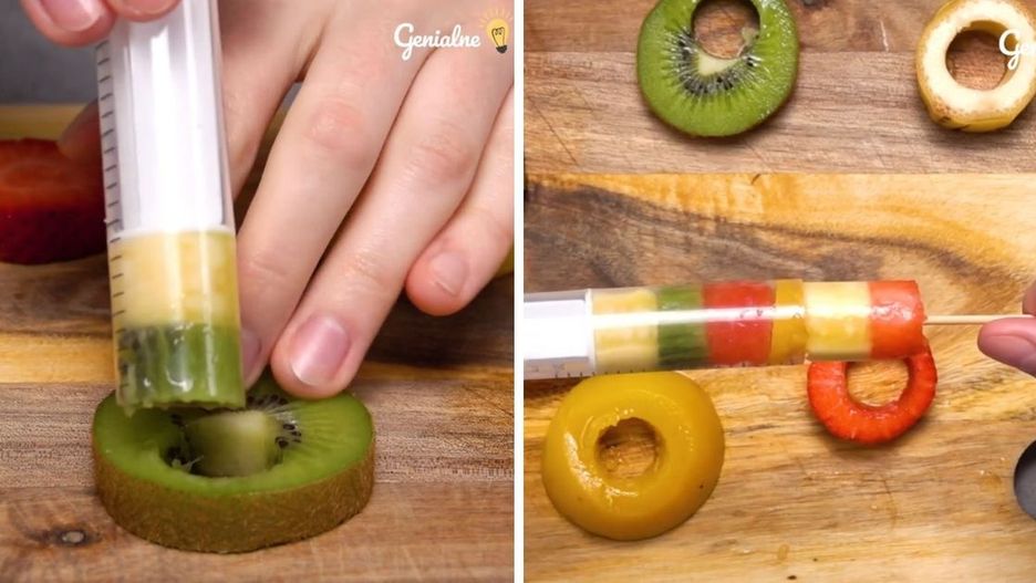 Z pomocą przyjdzie strzykawka (oczywiście bez igły). Wykrój z jej pomocą fragmenty owoców, nie wyciągając kawałków ze środka, a "dopychając" je do wnętrza. Wbij w nie patyczek do szaszłyków i wyciągnij owocową wieżę.