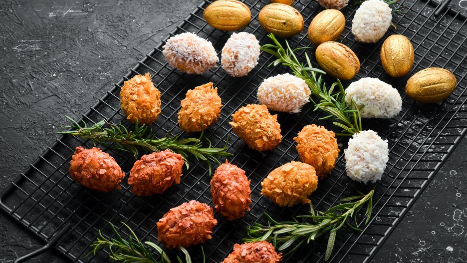 Miłośnicy czekolady deserowej mogą skorzystać z trzeciej propozycji. Aby przygotować polewę, podgrzej pokruszoną tabliczkę czekolady gorzkiej lub deserowej z odrobiną śmietanki. Na suchej patelni upraż płatki migdałów, pokrusz je i obtocz w nich czekoladowe orzeszki.