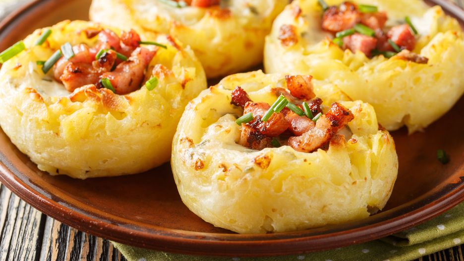 - Ziemniaki podawaj z przesmażonym boczkiem i cebulą.
