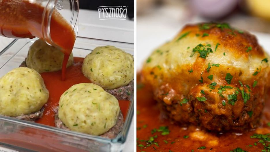 Z mięsa mielonego uformuj miseczki i umieść je w naczyniu żaroodpornym. Wypełnij mięso kulką z ziemniaczanego puree i zalej całość sosem pomidorowym. Możesz tutaj również użyć passaty pomidorowej z odrobiną ziół, soli i pieprzu.