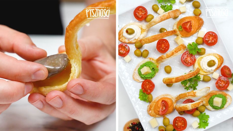 To jedna z najprostszych możliwych przystawek, której przygotowanie jest bardzo proste i tanie. Wystarczy arkusz ciasta francuskiego, ulubione dipy i trochę wyobraźni. Nasze łyżeczki wypełniliśmy hummusem i twarożkiem, ale możesz postawić na inne pasty, np. guacamole, salsę, pastę z pieczonej papryki. Ciasto francuskie jest na tyle uniwersalne, że sprawdzi się również na słodko: wgłębienia łyżeczek możesz wypełnić kremem czekoladowym lub owocowym musem. Dzięki temu nie zabraknie Ci już nigdy pomysłów na proste i efektowne przekąski na przyjęcia.