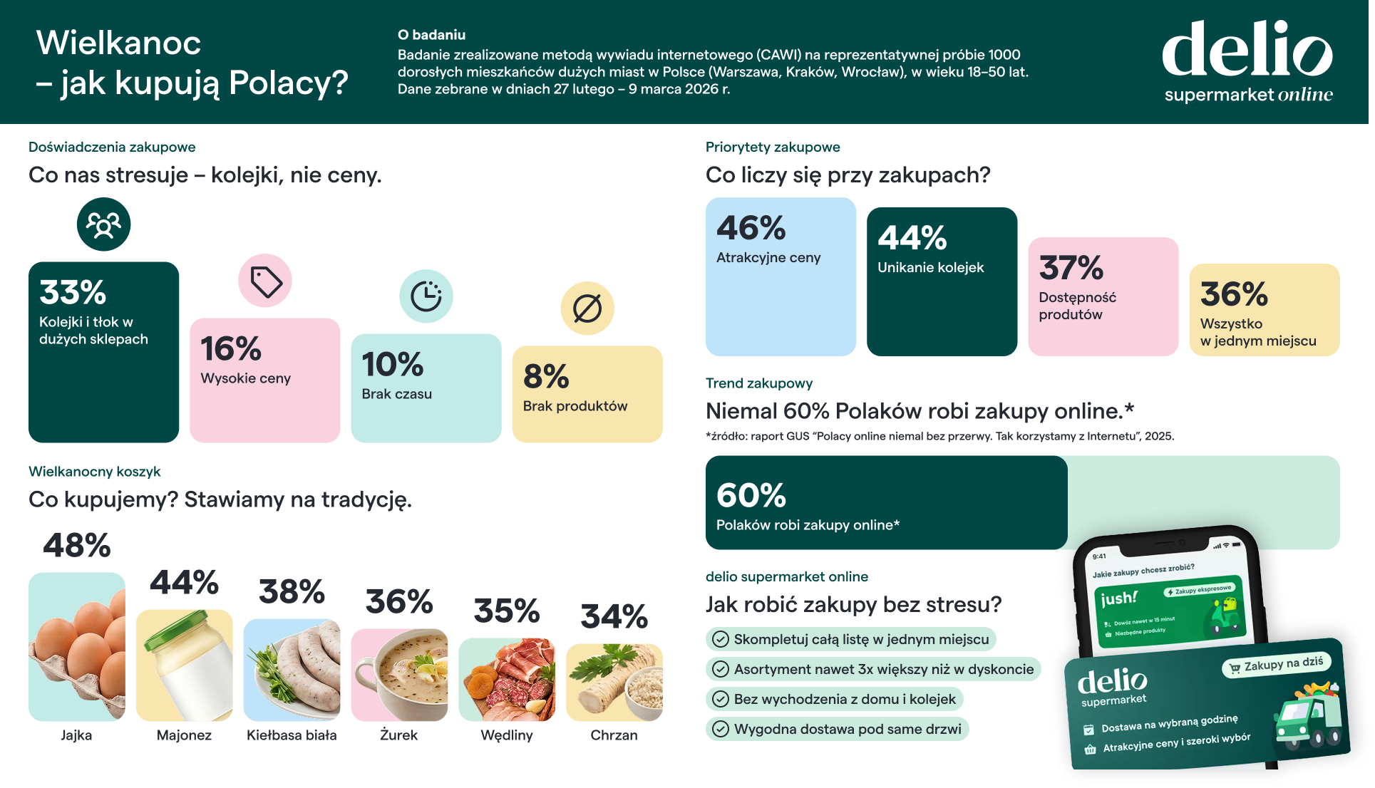 51% Polaków przed Wielkanocą najbardziej stresują zakupy, a nie ich koszt[1]. Z badania Opinia24 zrealizowanego na zlecenie delio supermarket online wynika, że największym źródłem napięcia są kolejki, tłok, brak czasu i trudności w skompletowaniu wszystkich produktów. Dlatego przed świętami coraz większego znaczenia nabierają rozwiązania, które pozwalają zrobić większe zakupy wygodnie, online i z dostawą do domu.