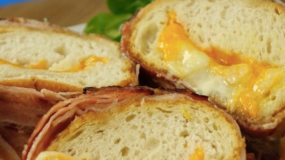 Poniżej zobaczysz przepis na przyrządzenie przekąski z bagietki z trzema rodzajami sera i boczkiem.