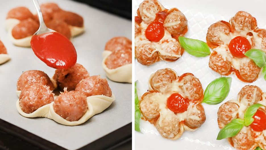 Kiedy wpaść mają do mojego domu goście, nie wyobrażam sobie nie przygotować czegoś smacznego. Odwiedziny rodziny i przyjaciół nie muszą z kolei oznaczać długiego stania w kuchni i mozolnych przygotowań. Proste kwiatuszki z mięsa mielonego na kruchym cieście robi się naprawdę bardzo szybko. Jeszcze szybciej znikają z talerza, bo mięsne kulki w połączeniu z sosem pomidorowym oraz mozzarellą błyskawicznie przypadną do gustu twoim bliskim. Kilka prostych składników, kilka minut w kuchni, dwadzieścia minut w piekarniku i gotowe.