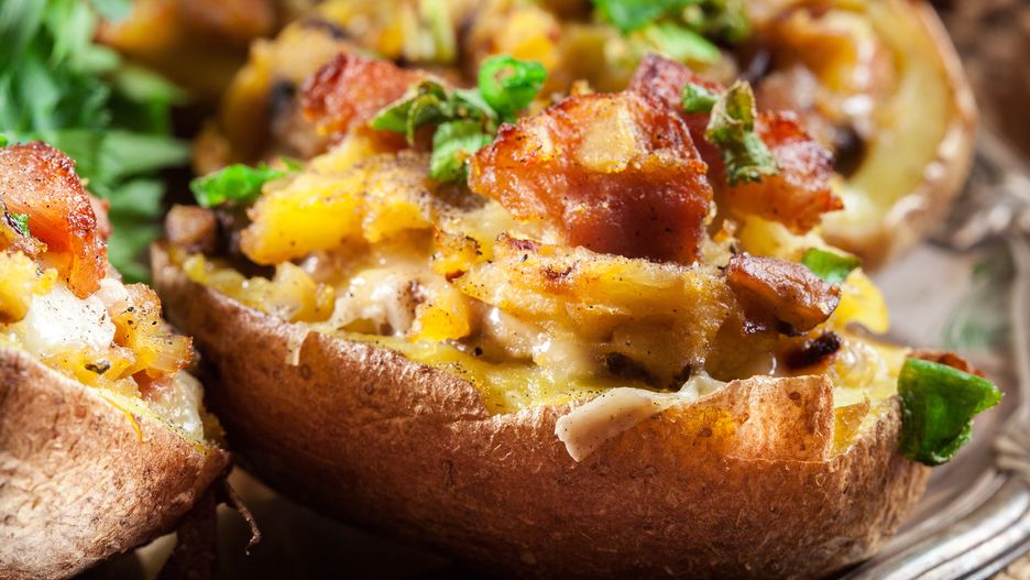 Do tego przepisu najlepiej sprawdzą się ziemniaki typu B lub C, czyli takie, które po upieczeniu są miękkie i lekko kremowe w środku, chociaż większość zwykłych ziemniaków obiadowych również sprawdzi się dobrze. To, jaki farsz trafi do środka, zależy od tego, co lubisz i co akurat masz w lodówce. W tej wersji przygotowujemy go z boczku, sera i cebuli, ale równie dobrze sprawdzi się mięso mielone, kurczak, a nawet wędzone tofu. Jeśli masz więcej czasu, możesz spróbować również wersji z chili con carne – pasuje do tych ziemniaków wyjątkowo dobrze.