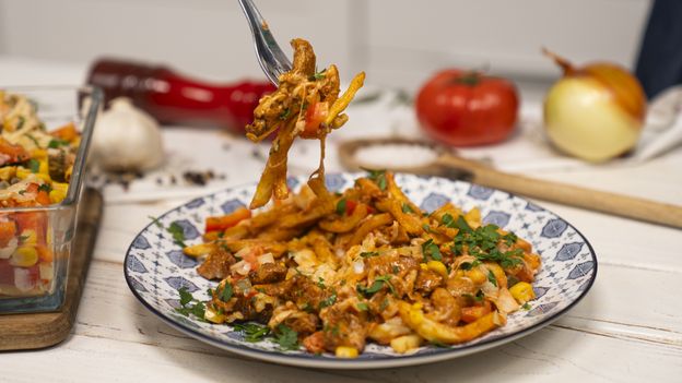- Jak złożyć zapiekankę? Zrób w formie pierwszą warstwę z upieczonych frytek. Na nich rozsyp mozzarellę i rozlej trochę sosu. Na wierzchu ułóż podsmażonego kurczaka. Mięso posyp warzywami, po czym polej je kolejną porcją sosu.