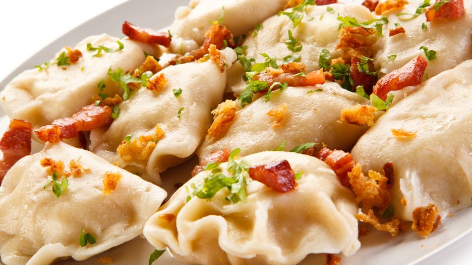 - Pierożki podawaj z okrasą z podsmażonego boczku i cebuli.