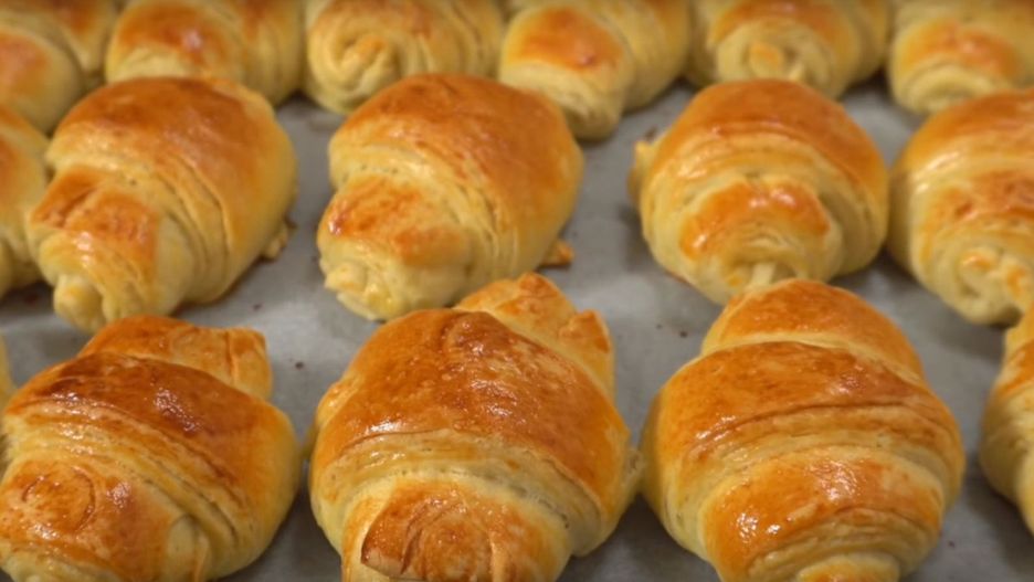 Rozwałkuj ciasto, podobnie jak na pizzę i posmaruj je masłem. Zrób tak z każdym kawałkiem. Teraz włóż je do zamrażarki na 30 minut. Po wyjęciu z zamrażarki, ponowie je rozwałkuj i przy pomocy noża do pizzy podziel je na 16 równych kawałków. Zwiń każdy kawałek w stronę środka. Ułóż je na blaszce wyłożonej papierem do pieczenia. Wymieszaj żółtko z 2 łyżeczkami mleka i posmaruj taką mieszanką wierzch chlebków. Piekarnik rozgrzej do 180 stopni i piecz przez około 35 minut. Smacznego!