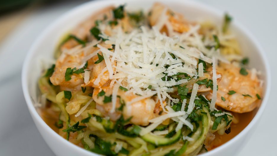 Przepyszne krewetki z makaronem z cukinii. Błyskawiczny przepis z piekarnika