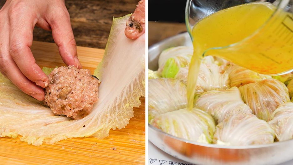 Krok 4: Formuję kulki z farszu i zawijam je w podgotowane liście kapusty pekińskiej.