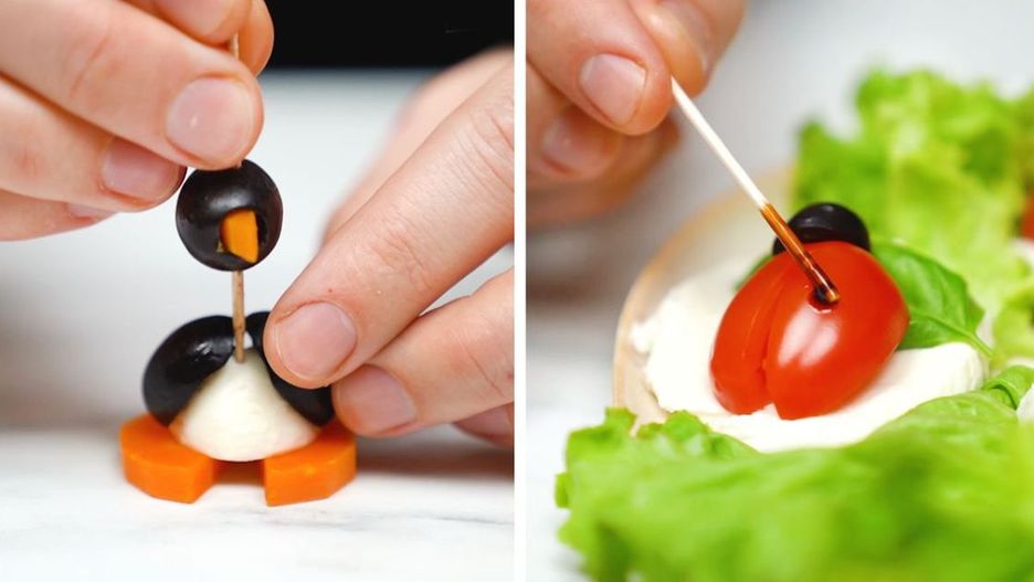 Nie od dziś wiemy, że droga do serca wiedzie przez żołądek. Odpowiednie podanie potraw odgrywa naprawdę ogromną rolę, bo to od oczu zaczynamy nasz posiłek. Nie trzeba mieć dużo talenty artystycznego i drygu do dekoracji, żeby zaserwować proste produkty w niebanalny sposób. Dziś w roli pysznych przystawek wystąpią pomidorowe biedronki, oliwkowe pingwiny i kanapkowe kwiatki. Taka forma podania sprawdzi się nie tylko podczas kinderbali, ale również w czasie rodzinnych spotkań czy imprez ze znajomymi.