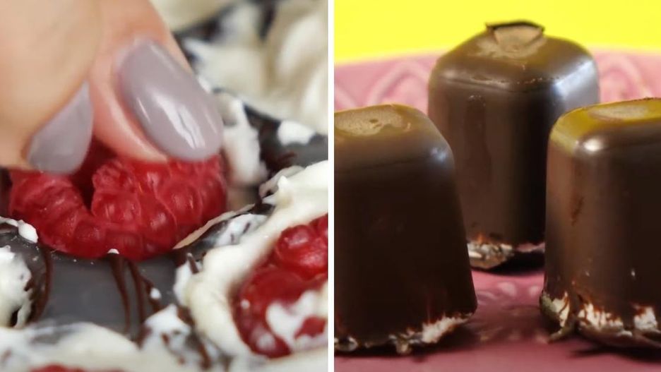 Następnie do każdej z nich włóż po 1 malinie. Na koniec polej wierzch mieszanką czekolady i oleju kokosowego. Włóż do zamrażarki na 45 minut.