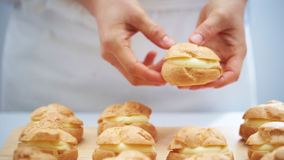 - Gotowe ptysie wyjmij z piekarnika. Przekrój je wzdłuż (poczekaj, aż trochę ostygną) i wyłóż do środka trochę nadzienia. Przykryj drugą połową ptysia. Smacznego!