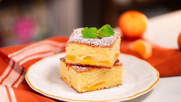 - Ciasto mandarynkowe przed podaniem posyp delikatnie cukrem pudrem i udekoruj listkami świeżej mięty.