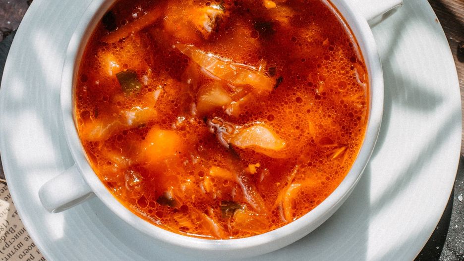 - Całość zalej wodą tak, aby przykrywała wszystkie składniki. Zmniejsz gaz i przykryj garnek pokrywką. Zupę gotuj przez godzinę, aż mięso stanie się miękkie.