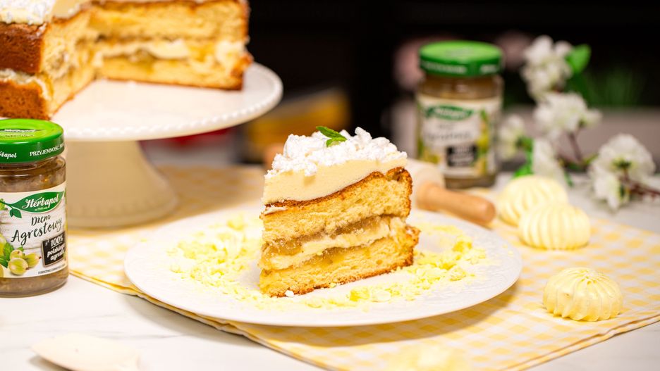 Kiedy temperatura za oknem wskazuje, że wreszcie nadeszły ciepłe dni, warto sięgnąć po owocowe, lekkie smaki. Puszysty biszkopt z dodatkiem cytrynowego kremu budyniowego, chrupiące bezy i słodko-kwaśny dżem agrestowy marki Herbapol to deserowy strzał w dziesiątkę. Świetnie zastąpi ciasta z ciężkimi kremami czy nawet klasyczny sernik. Na dodatek przygotowanie jest bardzo proste i nie wymaga żadnych tortowych umiejętności. Jego jasny, delikatnie żółty kolor i świeży aromat sprawiają, że od razu chce się ukroić przynajmniej jeden kawałek.