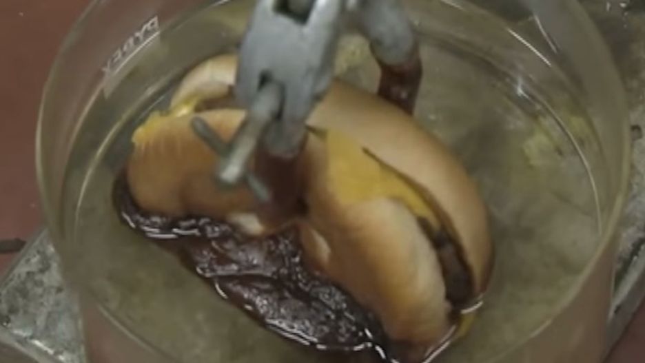 Oto co się dzieje, kiedy maczasz cheeseburgera w stężonym kwasie solnym, który jest jednym ze składników soku żołądkowego. Właściwie, jest to dokładnie to, co dzieje się w Twoim żołądku po zjedzeniu kanapki z McDonald's.