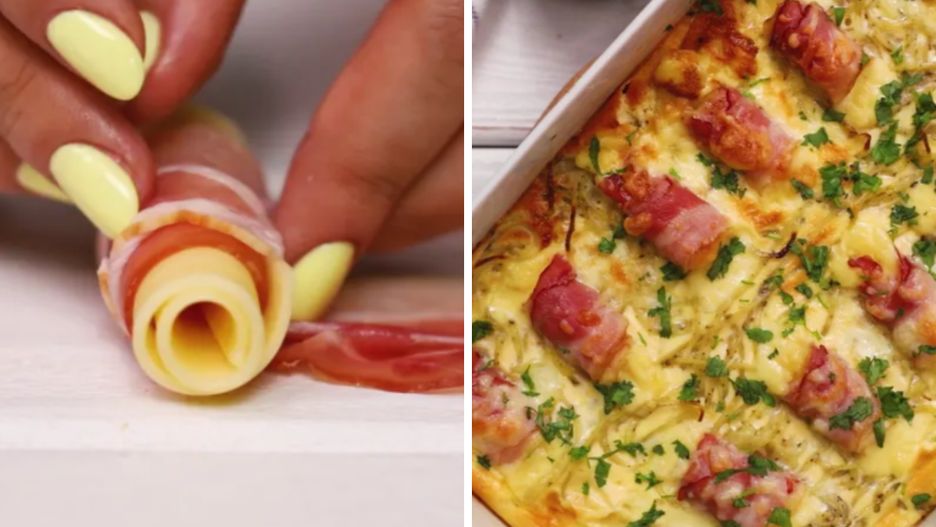 - Na koniec zostało przygotować urocze ruloniki. Aby to zrobić, wystarczy złożyć w rulon kawałki boczku i sera.