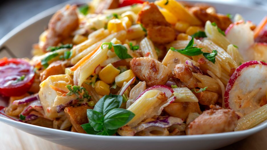 - Przestudzone mięso i makaron umieść w dużej misce.