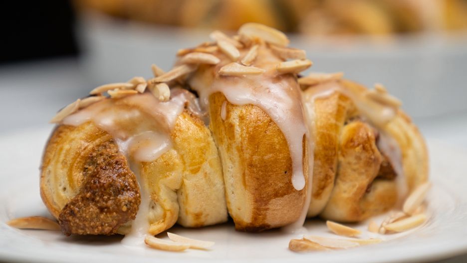 Gotowe rogale udekoruj przy pomocy domowego lukru i migdałów. I to wszystko!