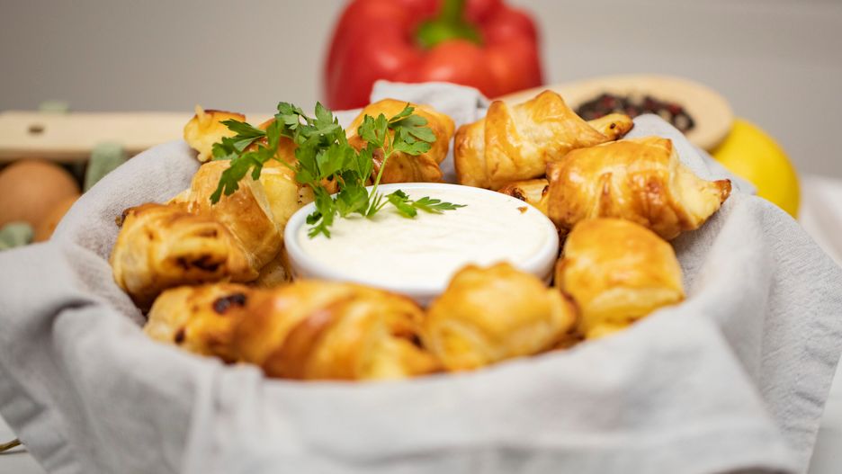 Rogaliki z ciasta francuskiego z wytrawnym farszem z serka i szynki to przepis na idealną przekąską. Z domowym dipem smakują najlepiej.