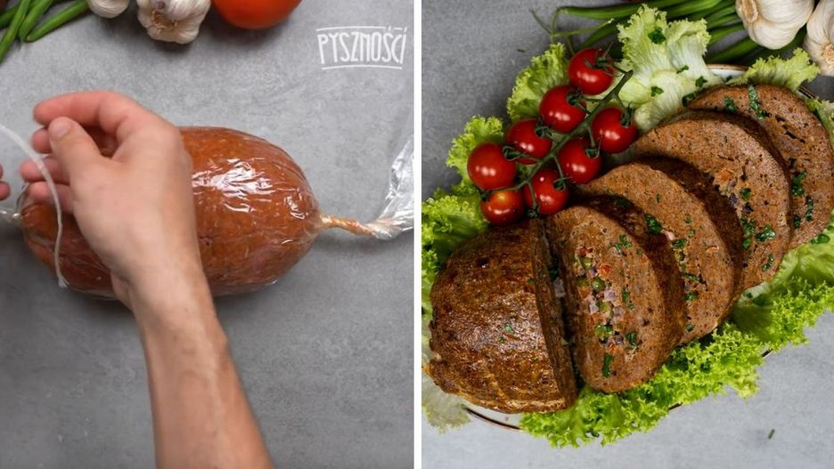 Wymieszane mięso przełóż do rękawa do pieczenia i uformuj kształt "cukierka". Dobrze zabezpiecz folię sznurkiem.