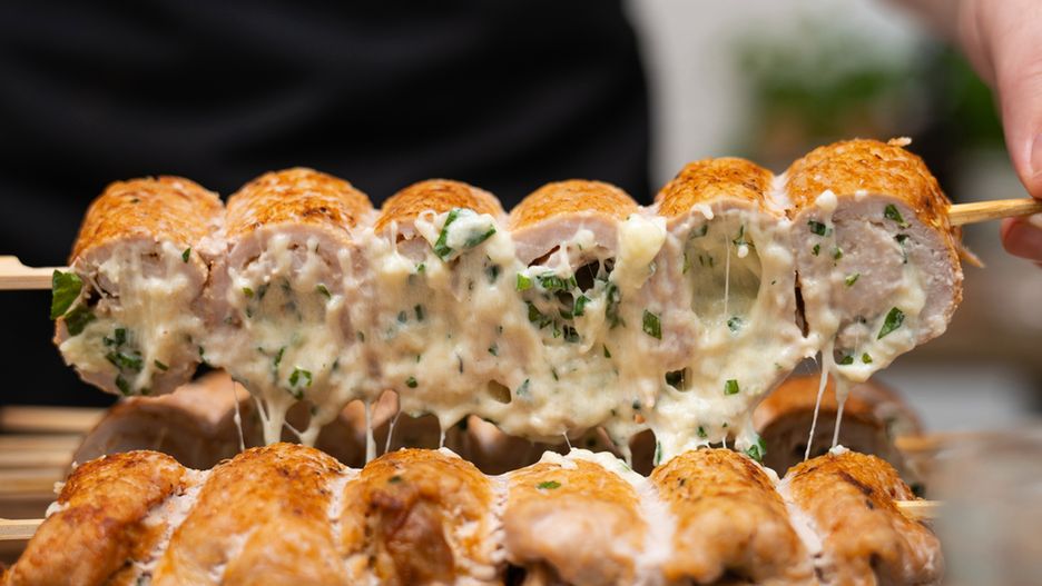 Każdy kawałek mięsa nafaszeruj wcześniej przygotowanym miksem na bazie mozzarelli. Następnie zwiń mięso w rulon. Powtórz proces kilka razy, po czym ułóż roladki schabowe ściśle w poziomie (jeden kawałek obok drugiego). Całą konstrukcję zabezpiecz przy pomocy drewnianych patyczków. I to wszystko!