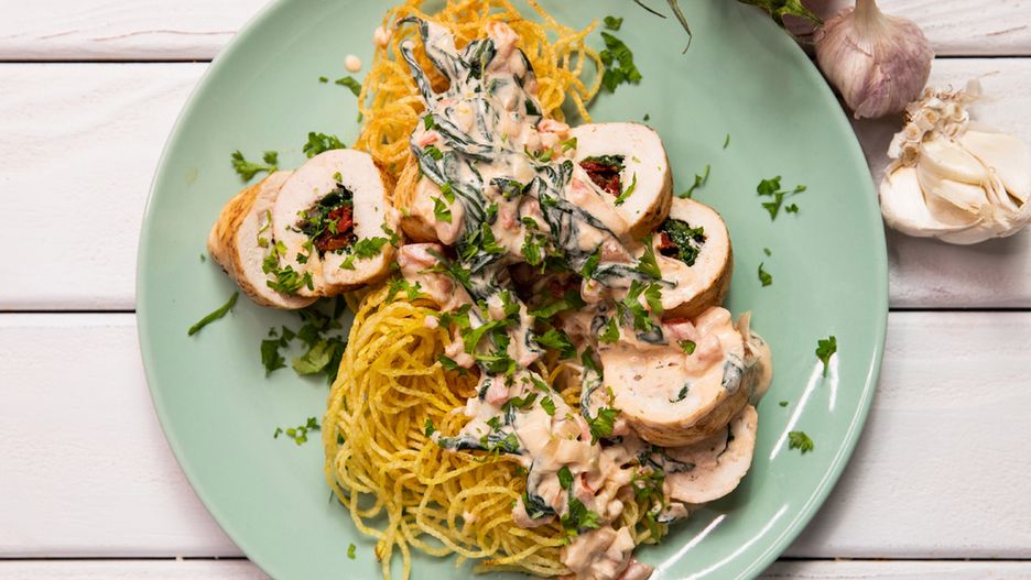 Roladki z kurczaka z kolorowym wnętrzem połączyliśmy z pysznym sosem i chrustem ziemniaczanym. I pomysł na genialny obiad już jest!