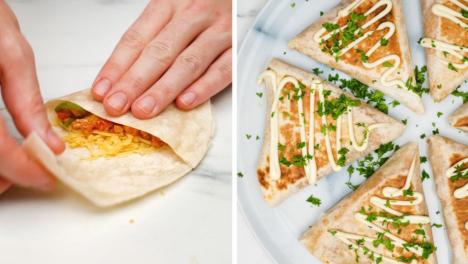 Następnie dodaj kukurydzę, pokrojoną w plasterki papryczkę chili i wymieszaj. Tortillę przekrój na pół. Jedną połowę posyp startym serem. Wyłóż porcję farszu i zawiń dwa brzegi. Zerknij na filmik- tam dokładnie pokazujemy Ci, jak to zrobić.