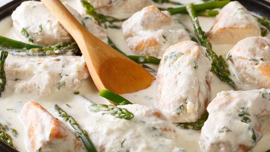 - Umieść w kremowym sosie kawałki dorsza oraz przygotowane wcześniej szparagi.