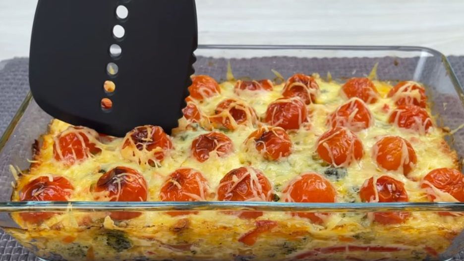 Wydrąż nasiona z papryki, pokrój ją w paski i wrzuć do pozostałych składników na patelni. Do oddzielnej miski wbij cztery jajka, ubij je trzepaczką. Podsmażone warzywa przełóż do miski z ryżem i zalej roztrzepanymi jajkami. Wszystko przypraw solą i pieprzem, dokładnie wymieszaj i następnie przełóż do naczynia żaroodpornego, wysmarowanego oliwą z oliwek. Wyrównaj wszystko dokładnie, a na sam wierzch wyłóż pokrojone na pół - pomidorki koktajlowe. Posyp startym żółtym serem. Wstaw do piekarnika rozgrzanego do 180 stopni i piecz przez 25 minut. Smacznego!